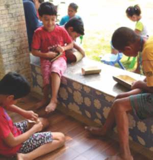 W tym szczególnym czasie trzeba było przeorganizować życie Ośrodka a dzieciom, które mają teraz dużo wolnego czasu, zaproponować różnorodne i angażujące zajęcia. Dzieci z radością zajęły się ogródkiem zwłaszcza, że dojrzewają już bakłażany, sałata , zielony groszek i inne warzywa. Ożywiła się praca w warsztacie bambusowym, produkcja koszyczków, pudełek i tym podobnych przedmiotów. Bardzo atrakcyjne stały się ćwiczenia fizyczne w dobrze wyposażonej sali fizjoterapeutycznej, które do tej pory nie budziły entuzjazmu. Świetnym pomysłem jest też samodzielne czytanie ulubionych książek w bibliotece przez godzinę dziennie. To nie tylko kształcenie umiejętności, ale też odkrywanie i przeżywanie radości z samodzielnej lektury. Do tego jeszcze uczenie się nowych pieśni. A więc nikt się nie nudzi. Niektóre zajęcia odbywają się pod kierunkiem starszych wychowanek.